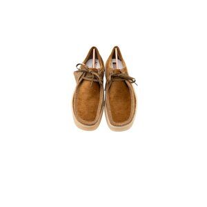 Stylish Clarks sneakers with a corduroy finish. Features a tan upper and cream sole. Perfect for casual wear.