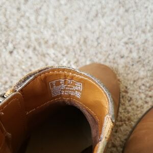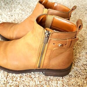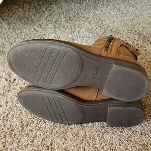 Stylish tan leather ankle boots by Clarks. Features side zipper and sleek design. Ideal for versatile wear.