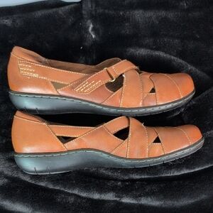 Clarks Tan Leather Flats with Woven Design. 8.5M. Euc