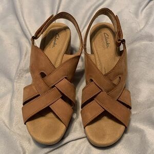 Clarks Tan Wedge Sandals with Cork Heel Giselle beach faux suede braid size 9
