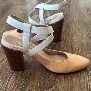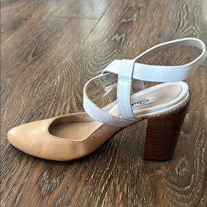 Clarks Tan and White Heels with Chunky Block Heel