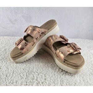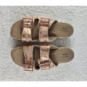 Slide platform sandal, Collection by Clarks, Ultimate Comfort. Leather upper in rose gold camouflage with rose gold metal buckle. Comfort sloe design with PU foam footed, ready for all day wear. Platform height 2.2" , sole has saw tooth finish for better traction. Very good condition.