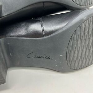 Keywords: Clarks loafers, women's slip-on shoes, black leather loafers, casual women's shoes, cushioned insole loafers, durable rubber outsole, stylish block heel shoes, elastic gore loafers, pre-owned Clarks shoes, women's size 11 loafers, UK size 8.5 shoes, EU size 42.5 loafers, Un Damson Adele model, slip-on casual shoes, women's leather loafers.