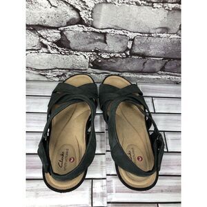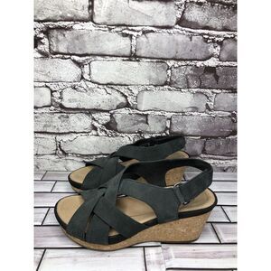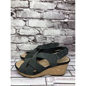 Clarks Unstructured Black Leather Criss Cross Strap Cork Wedge Sandals Women 7M