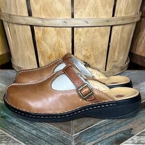Clarks Unstructured Tan Leather Buckle Strap Comfort Clogs Mules Womens Size 7