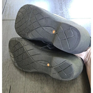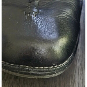 These Clarks Unsparrow black leather shoes are a perfect blend of style and comfort. The shoes feature a side zip closure, making them easy to slip on and off. The clog style and unstructured design provide a relaxed fit, while the leather upper material ensures durability. See picture of small are on front of shoe. All zippers work.
