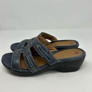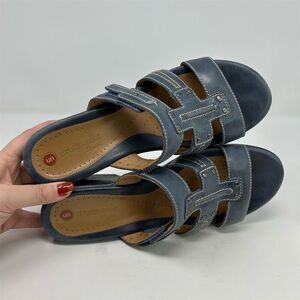Clarks Unstructured Women's Blue Leather Slip On Wedge Sandals Size 9.5 Comfort Casual