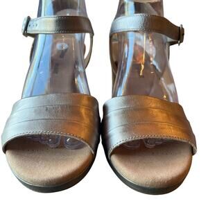 Clarks Wedge Sandals Size 9 Pewter Gold Metallic Leather Comfort Buckle Strap Cork