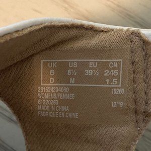 These Clarks sandals feature a sleek white design with elegant crossover straps, offering a minimalist yet stylish look. Crafted for comfort, they have a flat sole perfect for casual summer outings. The smooth material and airy design ensure a comfortable fit for all-day wear.