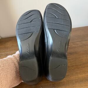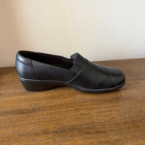 Clarks Woman’s May Marigold Black Leather Slip On Shoes- Size 10W