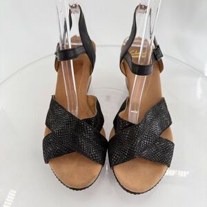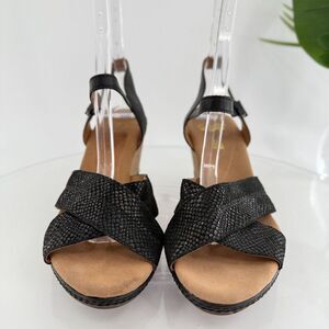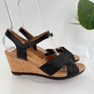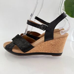 Clarks Women Helio Latitude Sandal Size 9 Black Leather Wedge Heel Ankle Strap