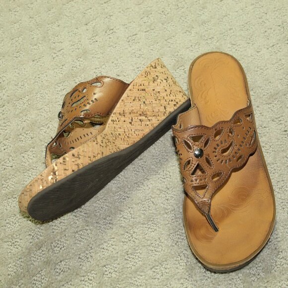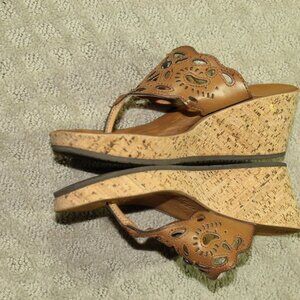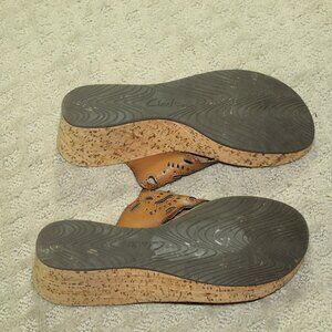 Clarks Women's 6.5 Brown Laser Cut Leather Cork Wedge Thong Sandals