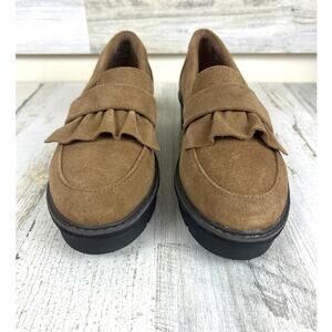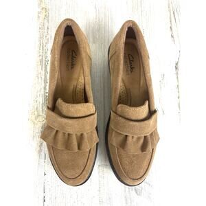 Clarks Airabell loafers, women’s size 8.5 shoes, brown leather slip-ons, platform loafers, Clarks women’s new shoes, ruffle detail loafers, comfort slip-on platforms, Clarks casual loafers, office work shoes women’s, Clarks leather loafers