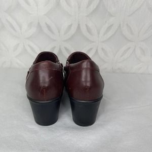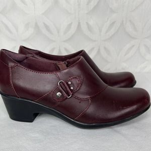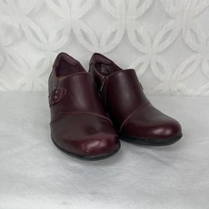Stylish Clarks ankle boots. Rich burgundy color. Sleek design with buckle detail. Comfortable block heel.
