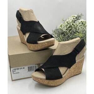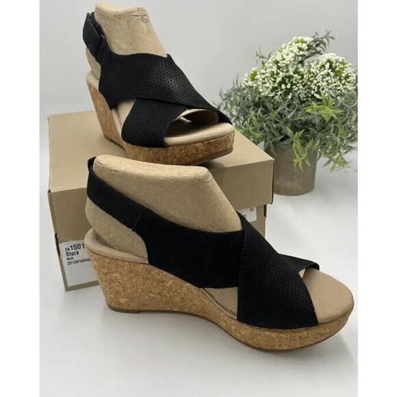 Clarks Women's Annadel Parker Black Suede Cork Wedge Platform Sandal Sz 7.5M New
