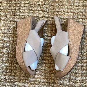Cork wedge with open toe and velcro closure strap at side of ankle, soft tan color, very comfortable