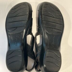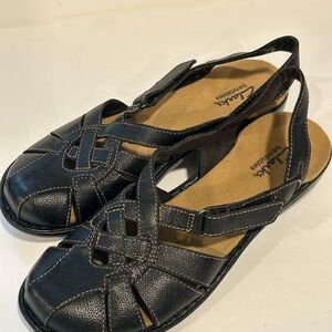 These Clarks Women's Bendables black leather sandals in size 8 are a stylish and comfortable choice for any outfit. The adjustable buckle closure and cushioned design provide a personalized fit and all-day comfort. Made from high-quality leather, these sandals are durable and versatile, perfect for everyday wear.