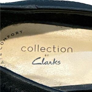 Sleek black leather flats by Clarks. Ideal for everyday wear. Comfortable and stylish.
