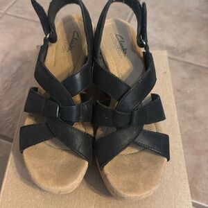 Chic black sandals by Clarks. Features a stylish crisscross design. Ideal for casual outings.
