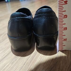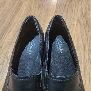 Elegant and comfortable black leather slip-on shoes for women. Perfect for any occasion. Made by Clark's in a size 8.5M. Gently used condition.
