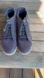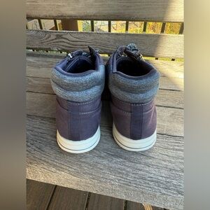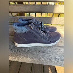 Stylish navy blue high-top ankle boots. Lace-up and zipper design. Comfortable fit.