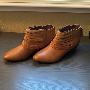 Briwn ankle booties by Clarks. Stylish layered design. Perfect for versatile wear and comfort. Soft cushion collection.