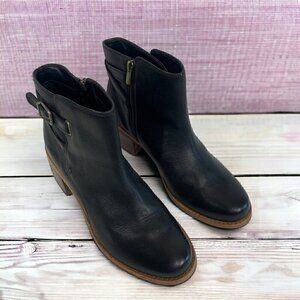 A like new pair of Clarks Clarkdale Jax black leather ankle boots with 2.5" heel in brown wood finish. Inner ankle zip entry and faux buckle and harness strap at the outer ankle. Cushioned leather insole and leather outsole with rubberized toe and heel. Size women's 10. The leather is beautiful and thick and it smells amazing! Photos are part of the description, please zoom in for more details.