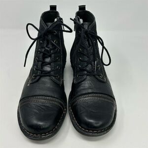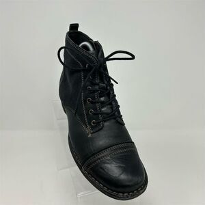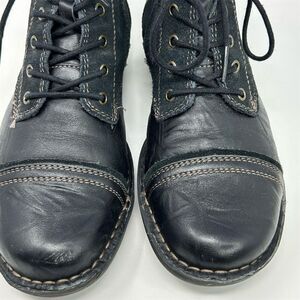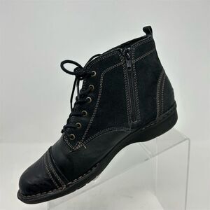 Brand: Clarks, US Shoe Size: 8, Style: Combat, Color: Black, Department: Women, Upper Material: Leather, Upper Material: Suede, UK Shoe Size: 5.5, EU Shoe Size: 39, Model: 26104715, Features: Soft Cushion Insole, Features: Sturdy Rubber Outsole, Closure: Lace Up, Country/Region of Manufacture: China, Condition: Pre-owned, Women's Combat Boots, Black Leather Boots, Clarks Women's Shoes, Lace Up Boots, Comfortable Women's Boots, Durable Outsole, Fashionable Combat Boots, Pre-owned Clarks Boots, Women's Size 8 Boots, Stylish Black Boots.