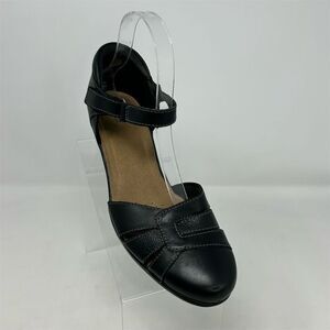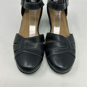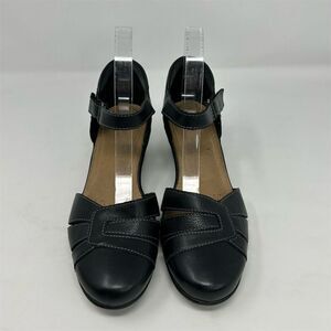 Keywords: Clarks pumps, women's black heels, leather block heels, mid heel shoes, closed toe pumps, formal women's shoes, adjustable ankle strap, cushioned insole heels, pre-owned Clarks shoes, black leather pumps, women's formal footwear, Clarks block heel, cut-out detailing shoes, Clarks size 9 heels, Clarks UK 6.5 shoes.