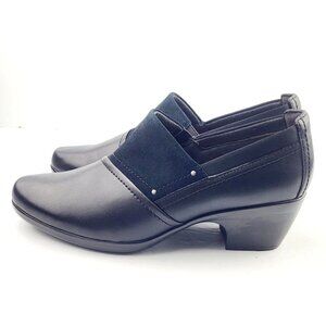 Women's Clarks, Emily Step Pump. These chunky heel pumps will boost your height and fashion style! Wear them for everything from work to play for a sleek look. Leather and manmade uppers 2 1/2 inch chunky heel.
