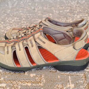 Clarks fisherman-style sandals are the perfect blend of comfort and practicality. Designed in a versatile neutral taupe/beige with subtle orange accents, these shoes feature a cushioned footbed, a protective closed-toe design, and an adjustable back strap for a secure fit. Very Light Wear • Comfortable • Great Everyday Summer Shoe