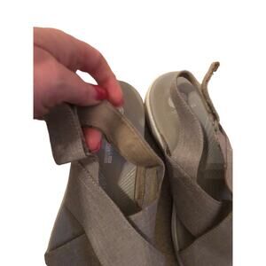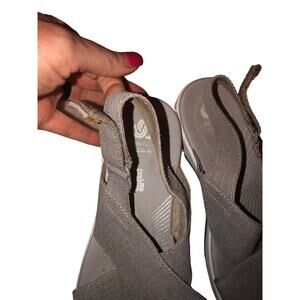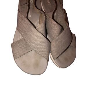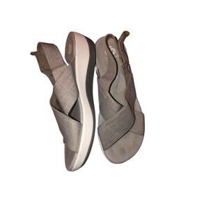 Keywords: Clarks, sandals, womens sandals, gray sandals, criss cross sandals, comfort sandals, walking sandals, casual sandals, slip on sandals, summer shoes, comfortable shoes, womens shoes