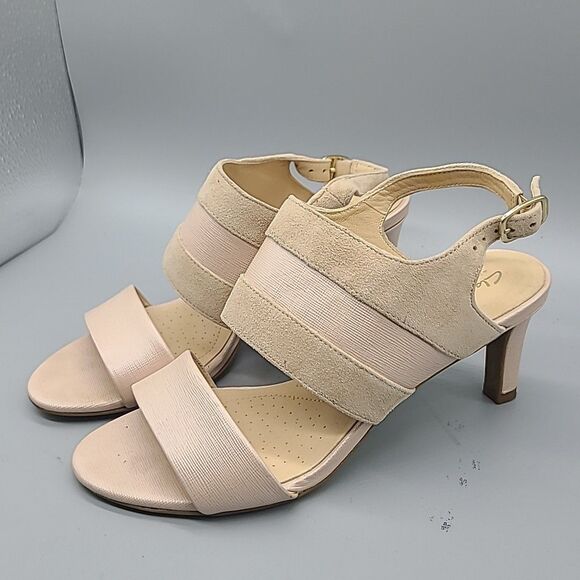 Clarks Womens sz 7 Laureti Joy Cream Suede Heeled Sandals