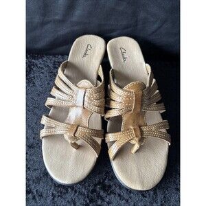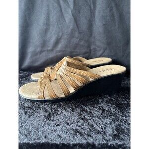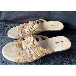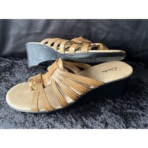 Clarks Women’s Leather Wedge Sandals 8.5M Tan Comfort Slip On Strappy Slide