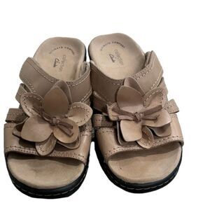Here are Clarks Collection Floral Sandals in a tan color. No holes stains or flaws.