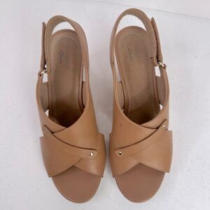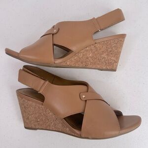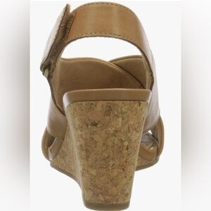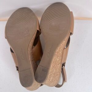 Clarks Women's Margee Eve Heeled Sandal Corked Wedges Tan Leather US Size 9.5