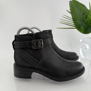 Clarks Womens Maye Strap Boot Size 5 M Black Leather Bootie Chunky Low Heel