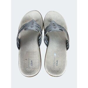 These Clarks metallic bronze wedge sandals exude a blend of comfort and style. With a strappy design and soft cushioned footbed, they are ideal for everyday wear or casual outings. Their sturdy wedge heel adds a touch of height without compromising on stability, making them both fashionable and functional.