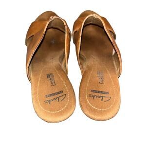 Clarks Womens Sandal 8.5 Wedge Soft Cushion Tan Cork Slip On Collection