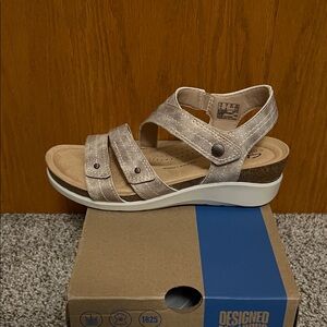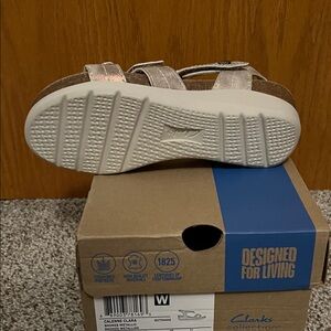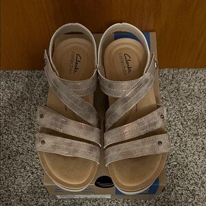 NWT Stylish Clarks sandals with metallic straps. Comfortable tan footbed. Perfect for casual wear.