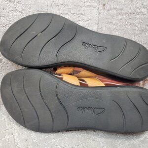 Clarks Women's Size US 10M Brown Leather Laser Cut Slip On Buckle Slide Sandals.