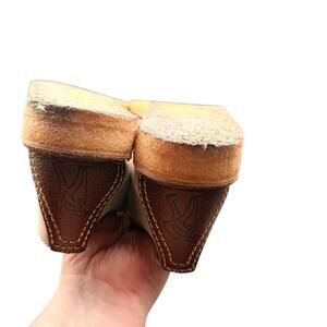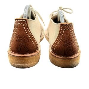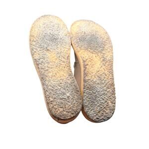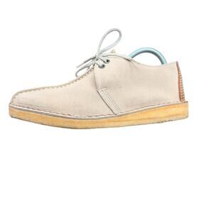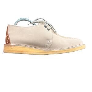 Clarks women’s suede Wallabee-style chukka shoes in beige with classic moc-toe stitching and natural crepe soles. Size 8M. Features stitched leather heel tabs with the Clarks figure logo. Suede uppers in great condition; crepe soles show normal wear but still plenty of life. Lightweight, comfortable, and perfect for casual, retro, and minimalist outfits.