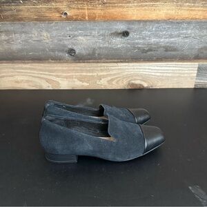 These ladies Clark’s black suede cap toe slip on loafers, are a size 7M and are new without the box. These shoes have been tried on, but not worn. Please see photos as they are part of the description and show the wear and condition of the shoes. Questions? Leave a comment below!