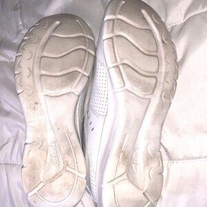 Crafted with a leather upper, these Clarks women's sneakers offer a blend of comfort and style. Their lace-up design ensures a snug fit. The perforated detail adds breathability, while the white color complements any outfit. Suitable for casual outings or light activities, these sneakers are a versatile addition to your wardrobe.