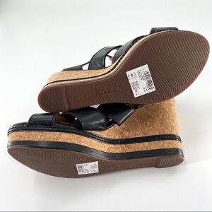 Clark’s collection black leather Zia Tower platform cork wedge, cushion soft inside, t strap & buckle at ankle. NEW never worn 8.5 Wide