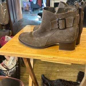 Clark’s beautiful medium gray ankle boots. They are suede with a zipper on one side and a buckle on the other. The size is 6 1/2. They are in gently used condition. The boots have a one and a half inch heel.