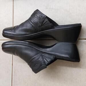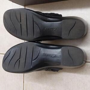 Women’s black leather Clark's Bendables 8M. slide on shoes with 1.5-2" flat heels, they run flat along the floor. They run a little small. I usually wear a 7.5 or 8 and these were too tight. they're in great pre-owned condition. there is a little wear. please see the pictures.