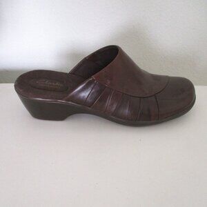 Clarks bendables Womens Brown Leather Mules w/2" Block Heels. Size 9.5M. Previously owned but lightly used, leather uppers are in excellent condition, as are the textured non-slip soles, while only the heels reveal minimal wear.
