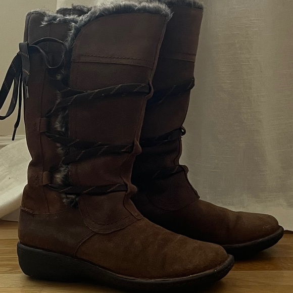 Tried on once. Get them while available for your winter vacation. Leather, fur lined.