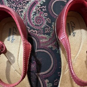 Clarks closed toe shoes color red shoe size 8 Velcro on the side two inch heel. Soles are in good condition. Some signs of wear on the right heel. Very comfortable shoe. Please make an offer.